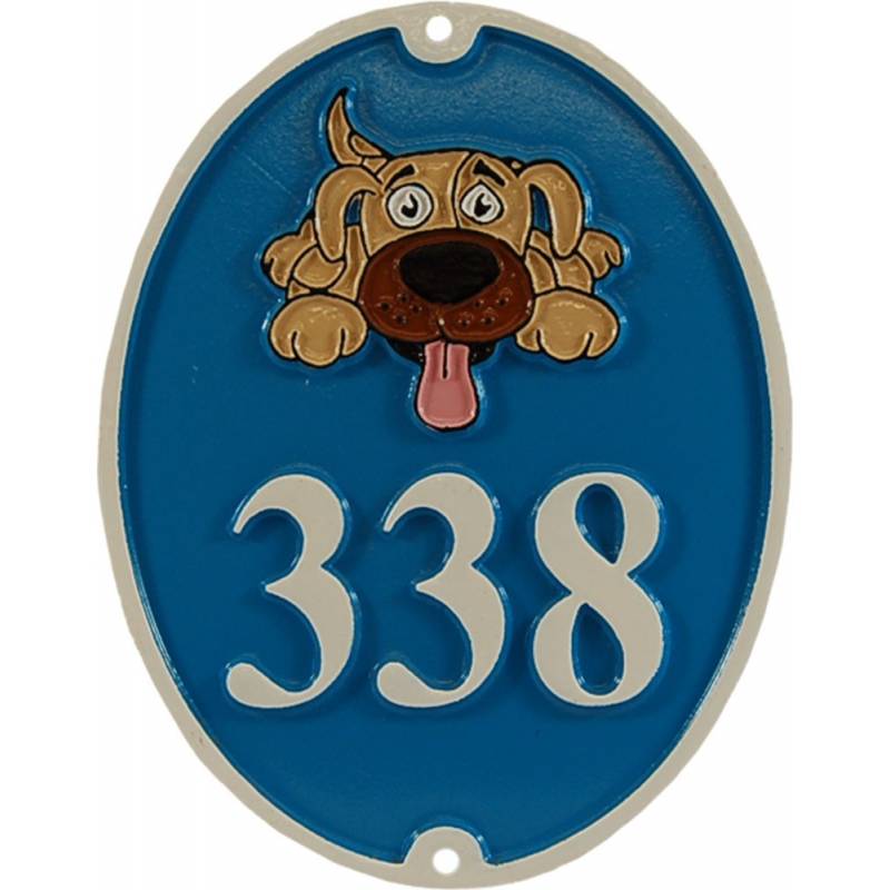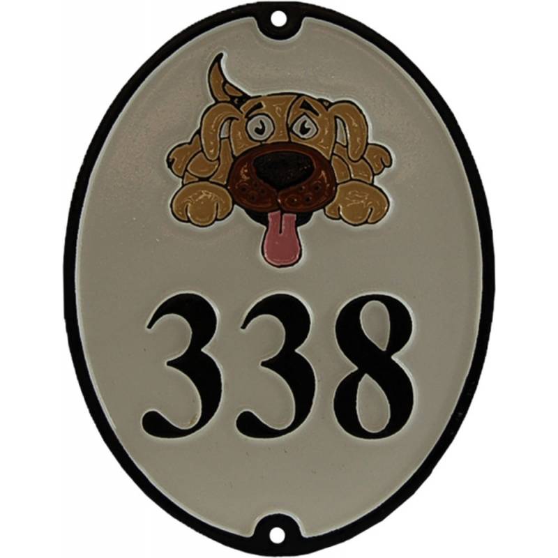 House number, oval, with a dog decorated in color