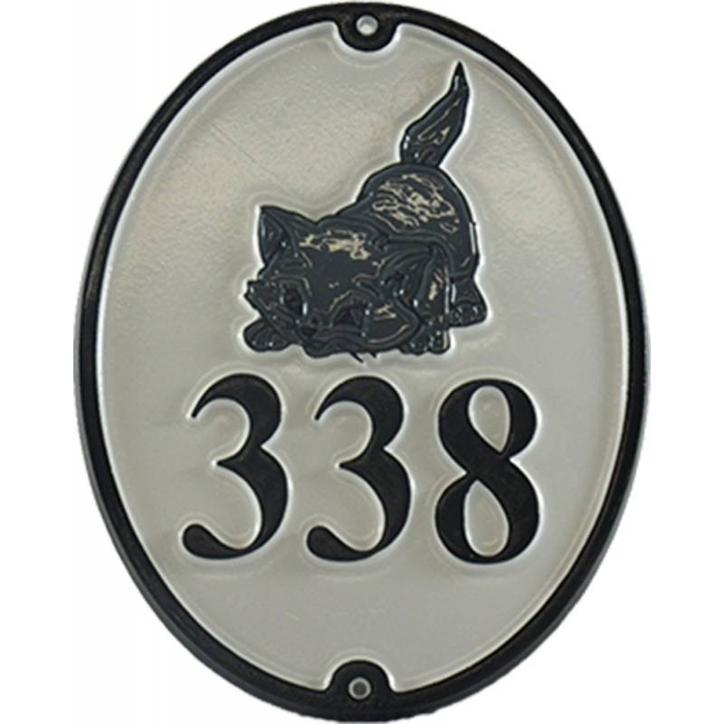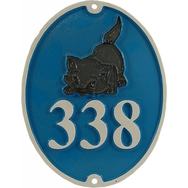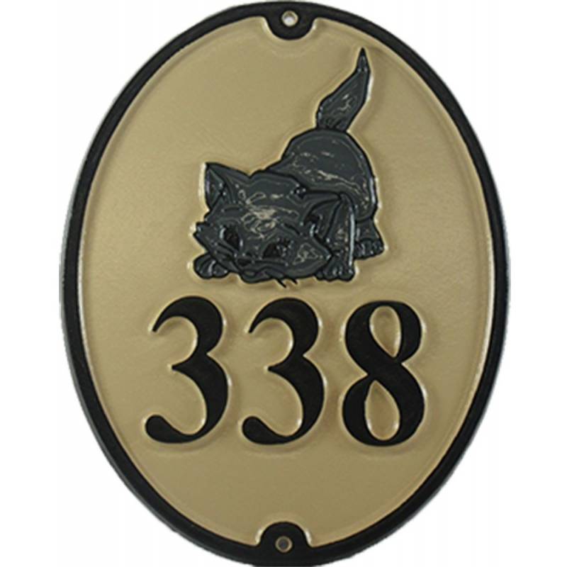 House number, oval, with a cat decorated in color